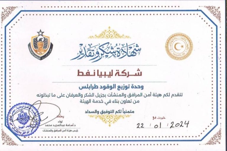 تم تكريم وحدة التوزيع بمستودع طرابلس من قبل هيئة أمن المرافق والمنشأت نظير موجهوداتهم المبذولة وتفانيهم في العمل